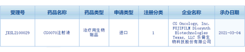 樂普生物科技股份有限公司(以下簡稱“樂普生物”)“CG0070注射液”臨床試驗(yàn)申請已獲國家藥監(jiān)局藥品審評中心(CDE)受理(受理號:JXSL2100029),并于2021年3月4日公示。